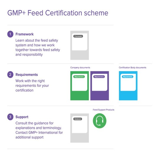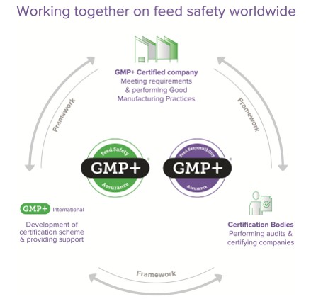O esquema de Certificação de Alimentos para Animais GMP+ garante o mesmo nível de segurança de alimentos para animais em todo o mundo. Os requisitos são objetivos, baseados na ciência e práticos. As normas e requisitos internacionalmente aceites para a garantia da segurança de alimentos para animais, como GMP, HACCP, Medidas de controle para riscos identificados, requisitos de gestão da qualidade ISO, rastreabilidade e medidas corretivas, conforme descrito pela legislação da UE, são líderes. Por outro lado, o esquema de Certificação de Alimentos para Animais GMP+ garante que as empresas possam trabalhar de forma responsável com base em iniciativas de mercado.