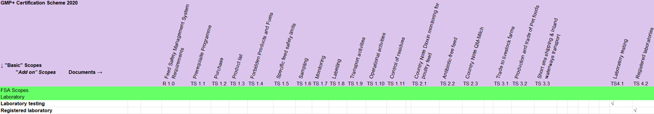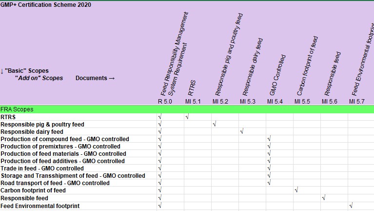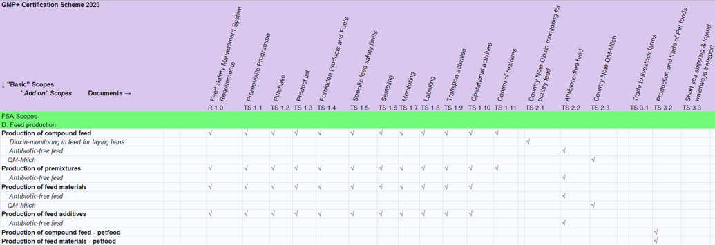 For each GMP+ scope for certification Scheme documents (Feed Safety Management System Requirements and/or Technical Specifications) are applicable. In the tables below you can find per GMP+ scope for certification which Scheme documents are applicable.