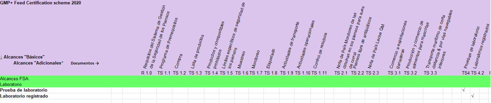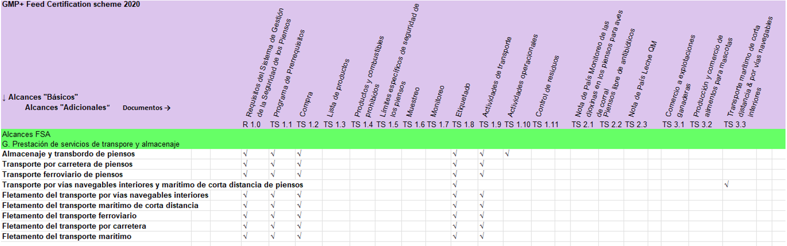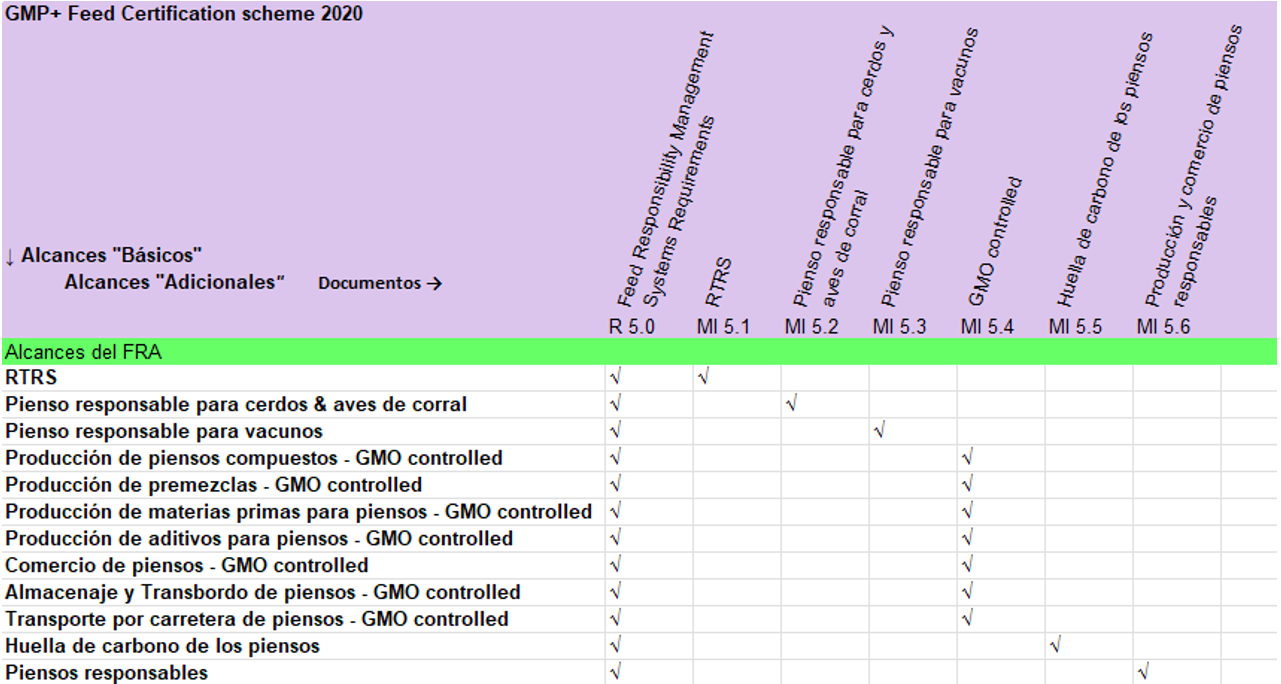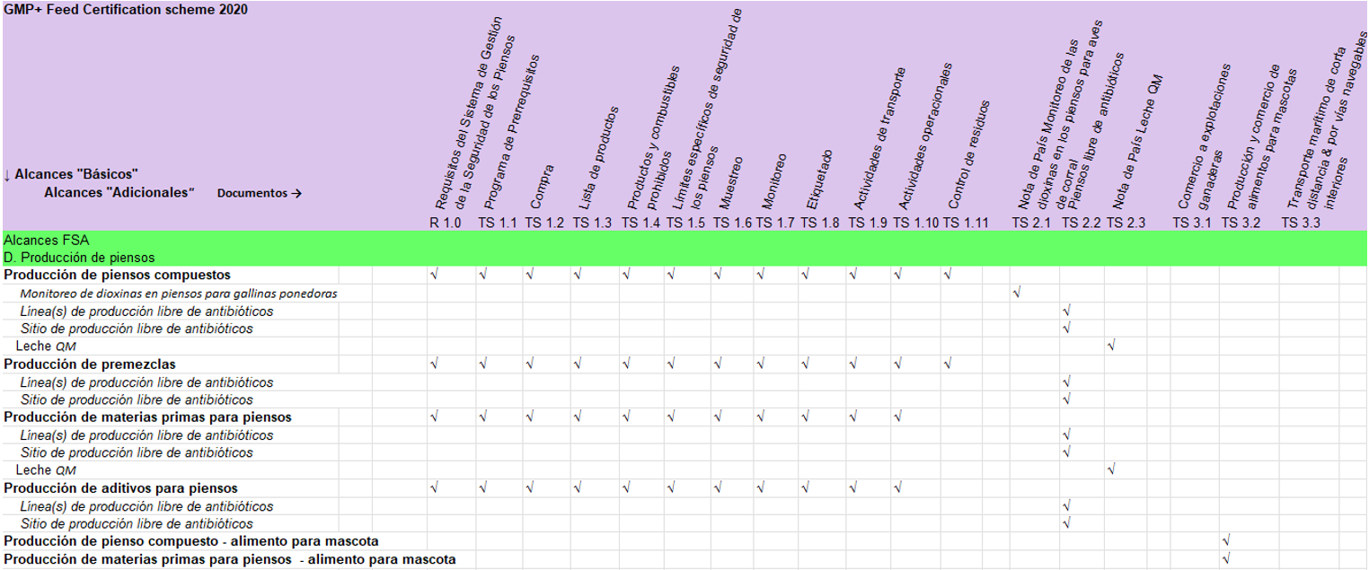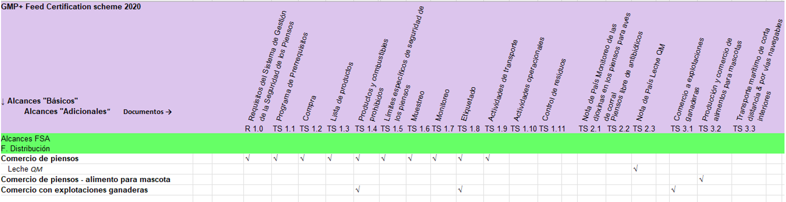 Para cada alcance de certificación GMP+, se aplican los documentos del Esquema (Requisitos del Sistema de Gestión de la Seguridad de los Piensos y/o Especificaciones Técnicas). En las tablas siguientes puede encontrar, por alcance de certificación GMP+ qué documentos del Esquema son aplicables.