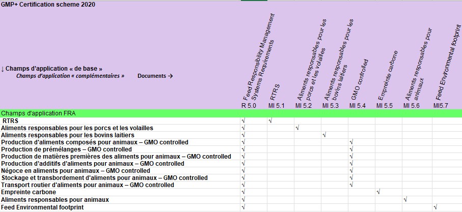 Pour chaque champ d'application de la certification GMP+, les documents du scheme (exigences du Feed Safety Management System et/ou spécifications techniques) sont applicables. Dans les tableaux ci-dessous, vous trouverez, pour chaque champ d'application de la certification GMP+, les documents du scheme qui sont applicables.