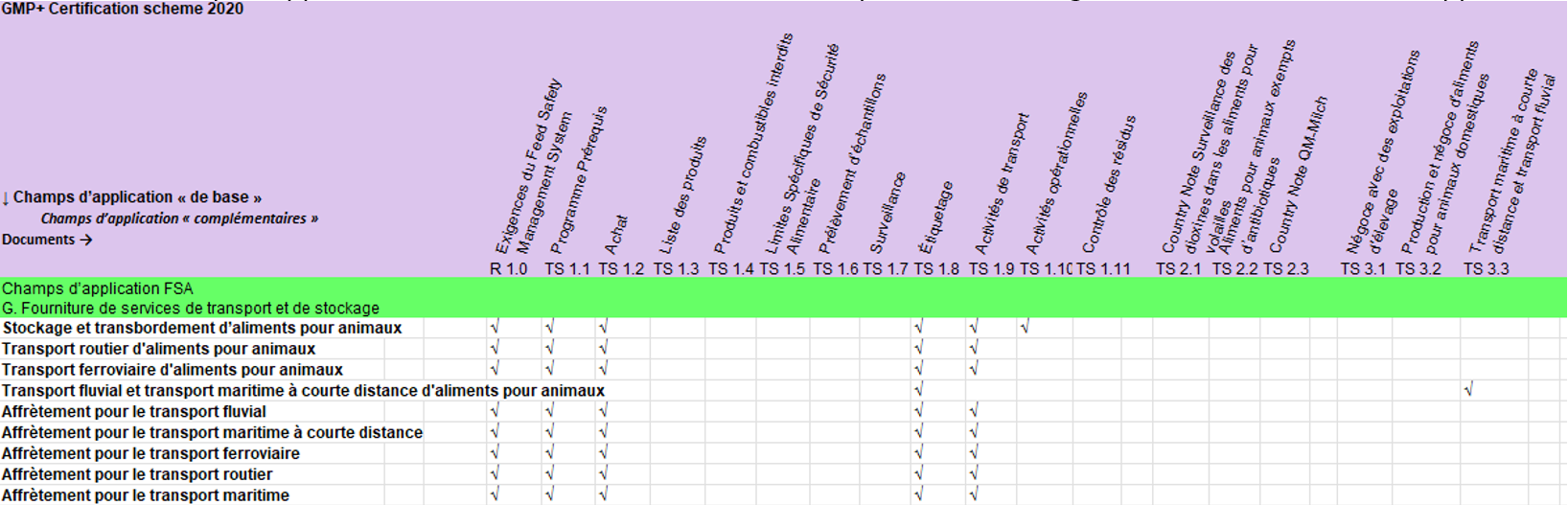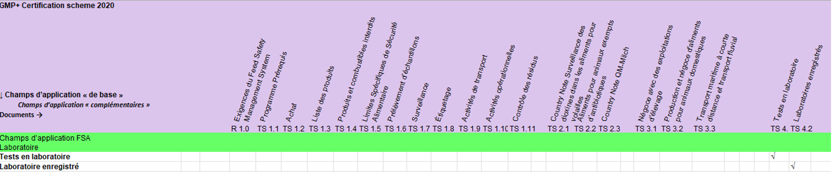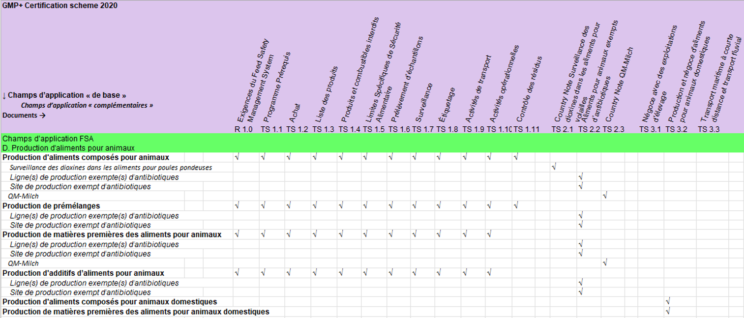 - Bien qu'une attention particulière ait été accordée à l'élaboration de ces tableaux, il se peut qu'en raison de vos activités spécifiques, vous deviez également vous conformer à d'autres (parties de) documents du scheme que ceux indiqués dans les tableaux, ou à une législation nationale spécifique. Il incombe toujours à l'entreprise d'aliments pour animaux de sélectionner tous les documents du scheme pertinents et de se conformer à toutes les exigences pertinentes.