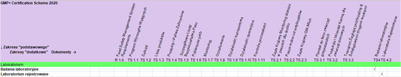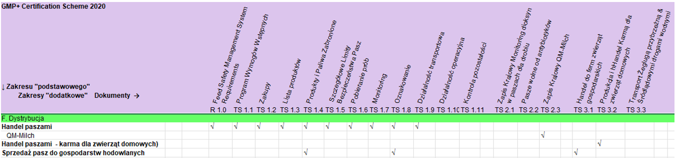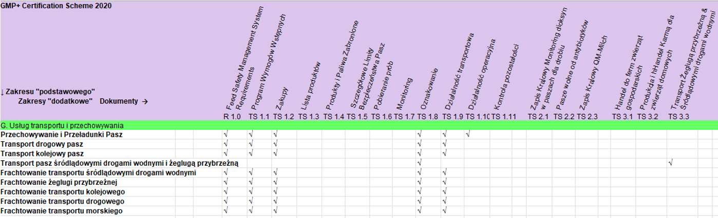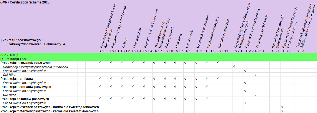 Dla każdego zakresu certyfikacji obowiązują dokumenty Systemu (Scheme) (Wymogi Feed Safety Management System i/lub Specyfikacje Techniczne). W tabelach poniżej możesz znaleźć jakie dokumenty Systemu obowiązują dla każdego z zakresów certyfikacji GMP+.