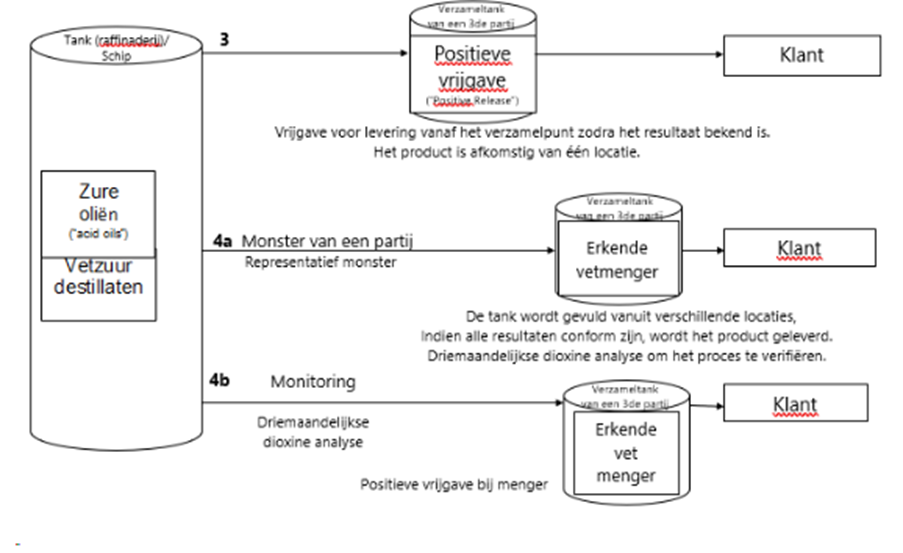 | 4a | De producent moet een representatief monster nemen voor de analyse van dioxines en dioxineachtige PCB’s voordat de producten de productielocatie verlaten. De producten worden vervolgens verzonden naar een opslagtank (dat zich ofwel kan bevinden bij z’n eigen locaties ofwel bij derden). Wanneer alle monsters, die de inhoud van de tank vertegenwoordigen, binnen de vereiste normen vallen met betrekking tot dioxines en dioxineachtige PCB’s, dan mag het product worden geleverd vanuit de opslagtank van derden naar de klanten. Ter verificatie moet de producent ieder kwartaal een monster van het mengsel uit de opslagtank nemen en laten analyseren op dioxines en dioxineachtige PCB’s. Indien de inhoud van de tank niet uit partijen bestaat die uit één productielocatie afkomstig zijn (optie 3) dan heeft de juridische entiteit die de tank exploiteert een erkenning nodig als inrichting voor vetmenging. | Deze optie is alleen geldig wanneer het bij de klant geleverde product een voedermiddel is. Wanneer het product een mengvoeder is, dan is deze optie 4a niet van toepassing. Er kan meer dan één productielocatie betrokken zijn, ook van andere producenten. Hoewel het product wordt verzonden vanaf de productielocatie, blijft de producent verantwoordelijk voor de verplichte monitoring. Hij moet de juiste correctie maatregelen nemen wanneer de analyseresultaten de productnormen overschrijden. De tank hoeft zich niet noodzakelijkerwijs in hetzelfde land als de productielocatie te bevinden. De producent moet volledige controle te hebben over de operationele opslagactiviteiten of moet een overeenkomst hebben met het opslagbedrijf bij gebruik van een tank van derden. Registratie van productie, transport en opslag moet duidelijk zijn en een volledige balans tonen. Het bestand met daarin de analysecertificaten moet compleet en duidelijk zijn. De klant moet geïnformeerd zijn over de analyseresultaten door middel van alle onderliggende analyseresultaten en de samenstelling (inclusief de verhouding van de verschillende componenten), tenzij de producent en de klant overeenkomen dat de klant wordt geïnformeerd door middel van een conformiteitsverklaring. De inhoud van de conformiteitsverklaring moet duidelijk, eenduidig en verifieerbaar zijn. Er moet een duidelijke koppeling zijn tussen de conformiteitsverklaring, de geleverde partij en de analysecertificaten. De producent is verantwoordelijk voor de extra kwartaal monitoring. |