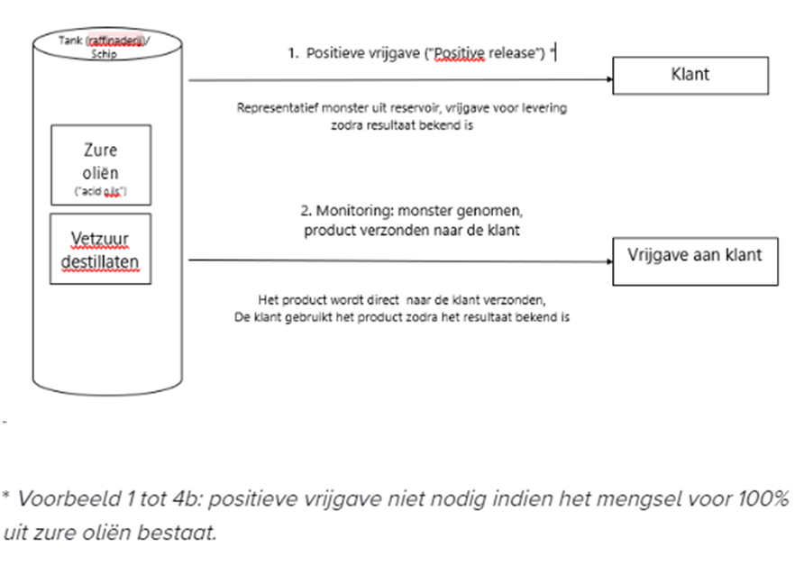 | 2 | De producent neemt een representatief monster van het product uit zijn opslagtank. Hij stuurt het monster vervolgens naar een laboratorium voor de analyse van dioxines en dioxineachtige PCB’s. In de tussentijd wordt het product verzonden naar de klant. De daadwerkelijke levering van het product (eigendomsoverdracht) vindt plaats nadat de analyseresultaten bekend zijn en conform zijn aan de specificaties. | Voor meer details m.b.t. monstername en analyse zie § 1.3 en § 1.4. Om deze optie te gebruiken, moet er een overeenkomst zijn tussen de producent en de klant. De klant moet geïnformeerd zijn over de analyseresultaten door middel van een analyserapport. |